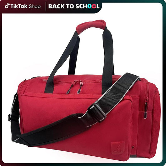 Sports Large Gym Duffel Bag Water Resistant Workout Overnight Backpack for Women & Men Weekender Overnight Bag Red Polyester Fabric Nylon Lining 55L Capacity 6 Pockets Zipper High Quality